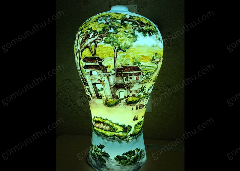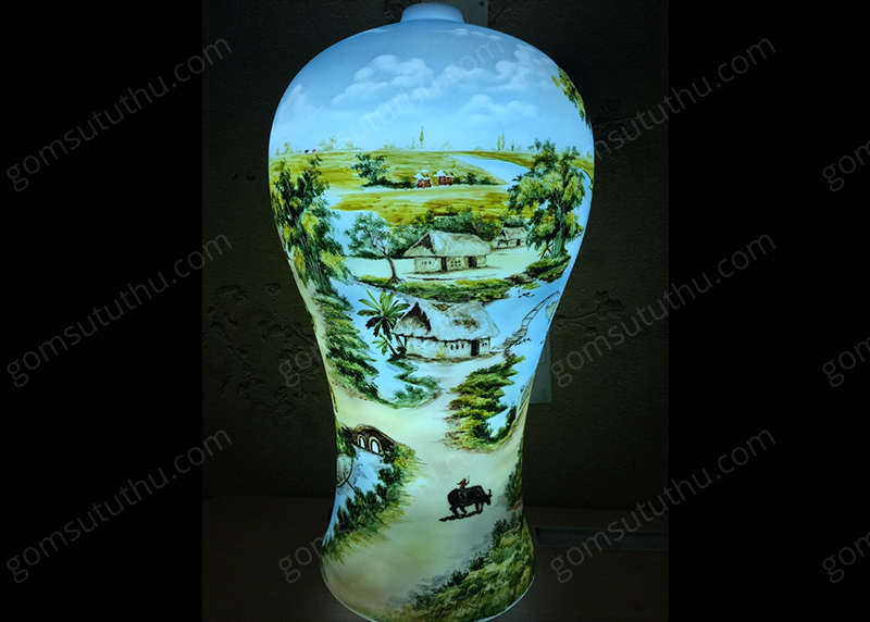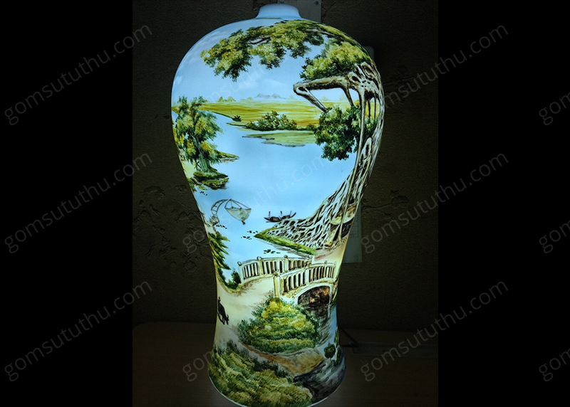 | Mô tả: | Đèn dáng mai bình cảnh quê hương Kích thước : 32*65 |